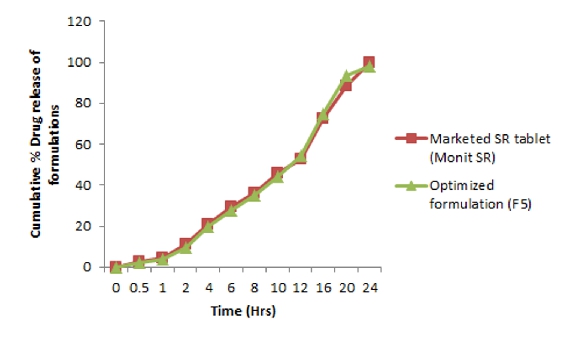 Figure 2. Comparison of Cumulative % Drug release of optimized formulation with marketed SR tablet (Monit SR)